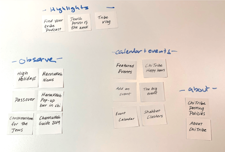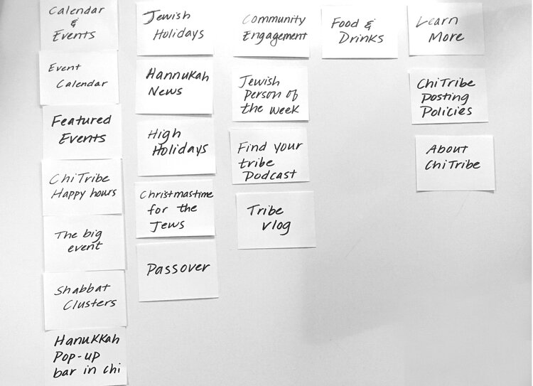 WeI started the research by first creating a screener survey with few questions about the Jewish community in Chicago. We then distributed it through different social mediums to gauge responses from different age groups. We got about 47 survey responses, 5 Task analysis and 10 interviews. The data that we received was really insightful. The true insights and information from interviews helped us find patterns through Affinity Diagramming